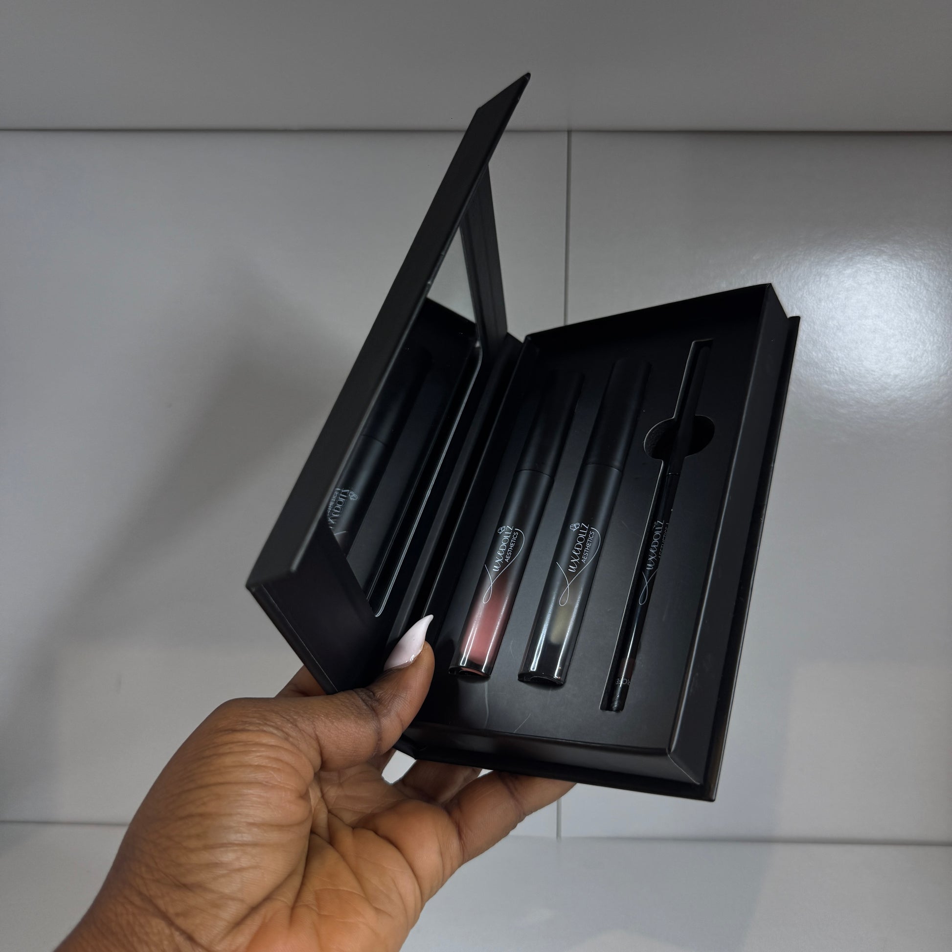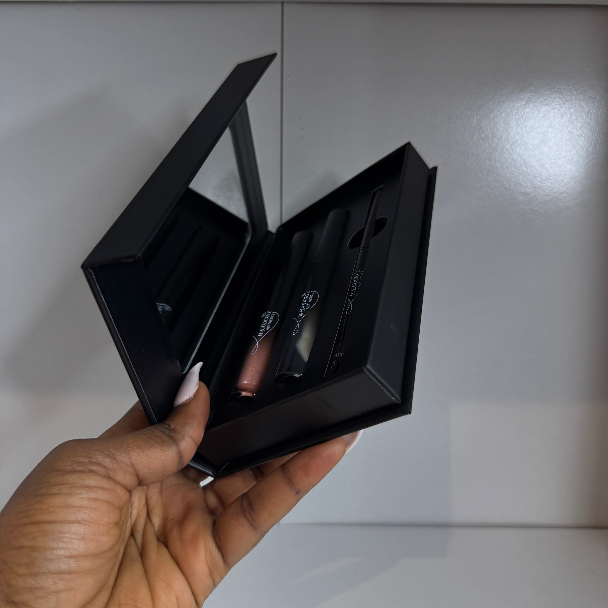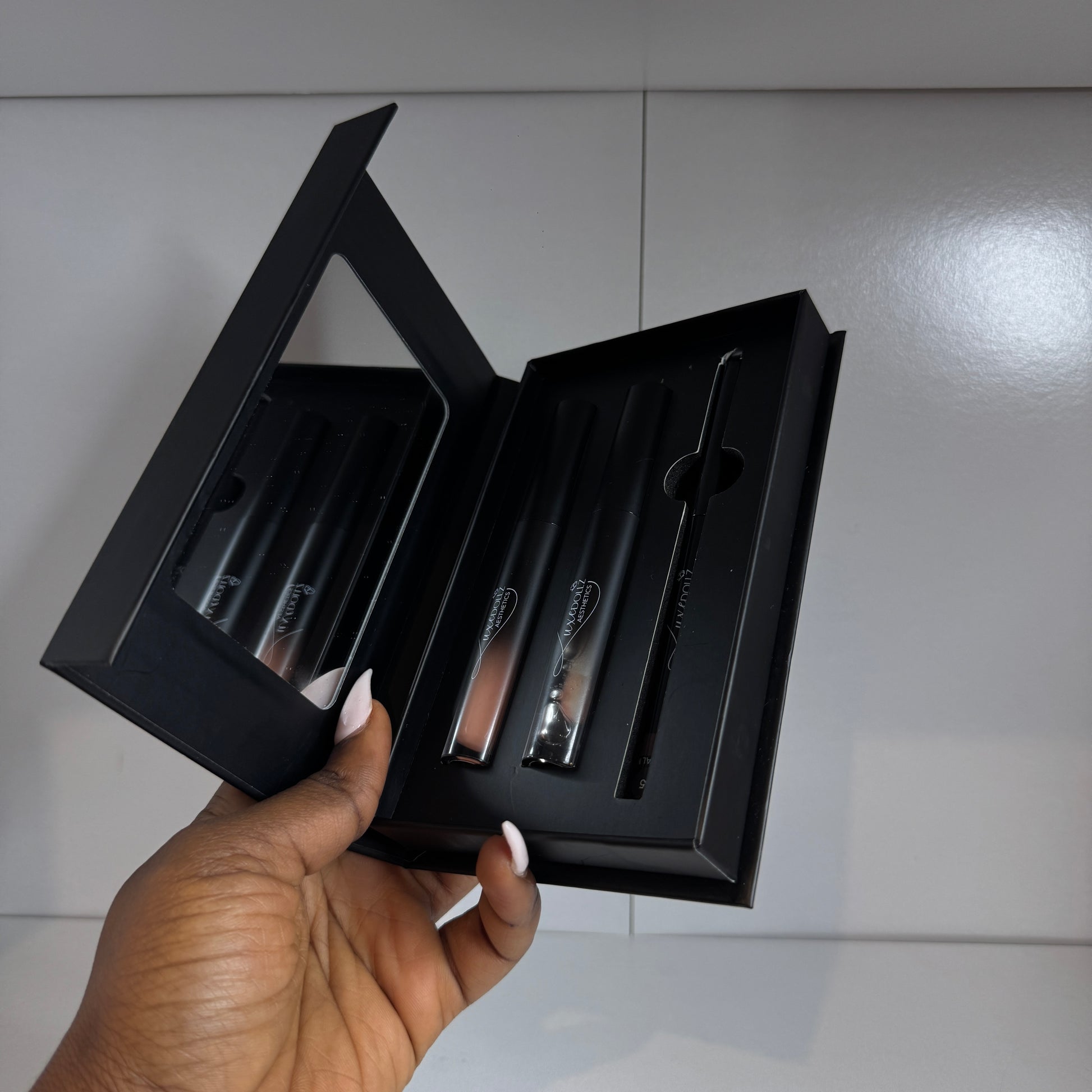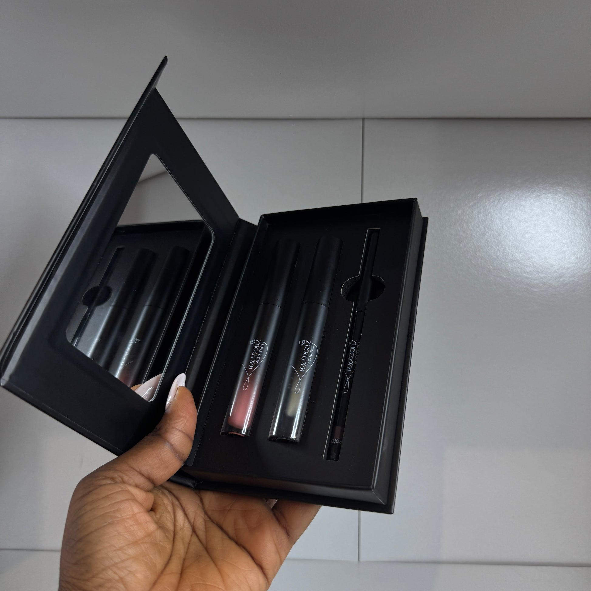 bringing to you the first ever > LDA trio lip kit has a built in mirror , a compact lip kit that’s perfect for on the go and feels like ur personal makeup artist , Enhance your lips with our Trio Lip Kit, specially made for brown skin girls! This kit includes a a compact build in mirror , clear lip gloss, matte liquid lipstick and complimentary brown lipliner to give you the perfect pout. Elevate your look and embrace your natural beauty with this must-have set. Try it now and show off your gorgeous lips!
